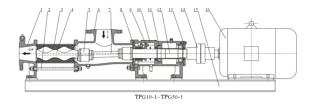 1. Body Body 2.Tie 3.Stator 4. Aci Skru 5. Perhimpunan Bersama Suniversal 6. Body Body 7. Koneksi aci 8. Tempat Duduk 9.Packing Gland 10.Bearing Housing 11.Bearing 12.Drive Shaft13.Bearing Cover 14.Coupling 15.Base 16.Motor