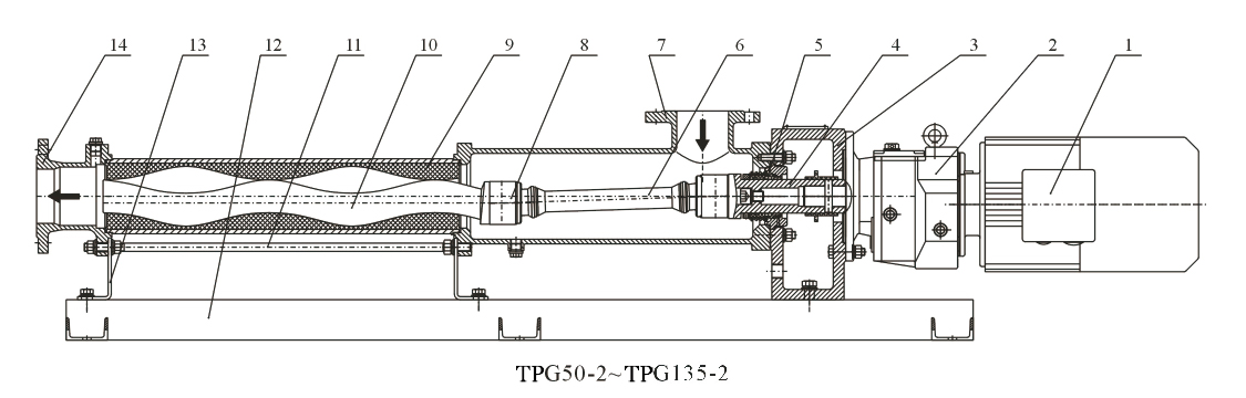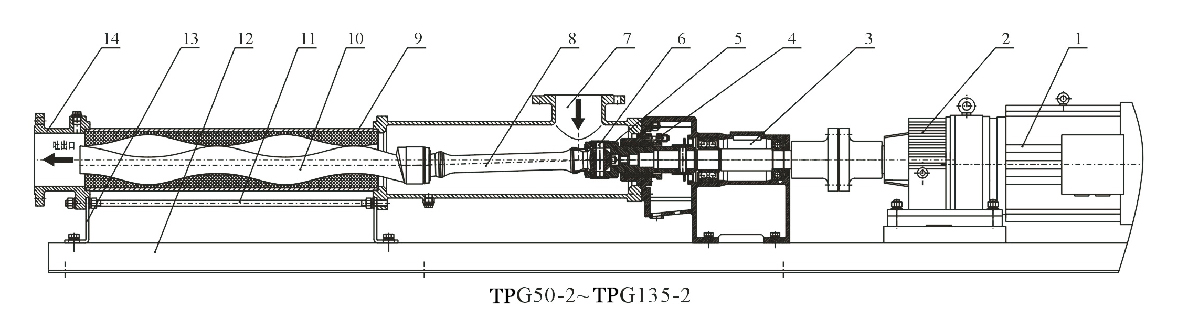 1.Motor 2.Gearbox 3. Sokongan Sambungan-Sambungan 4. Aci Tekstasi 5. Perhimpunan meterai mekanik 6. Koneksi rod 7. Dewan Pengekalan 8. Perhimpunan Bersama Suniversal 9.Stator 10.Rotor 11.Tie Rod 12.Base 13.Support Feet 14.DISCHARY BODY